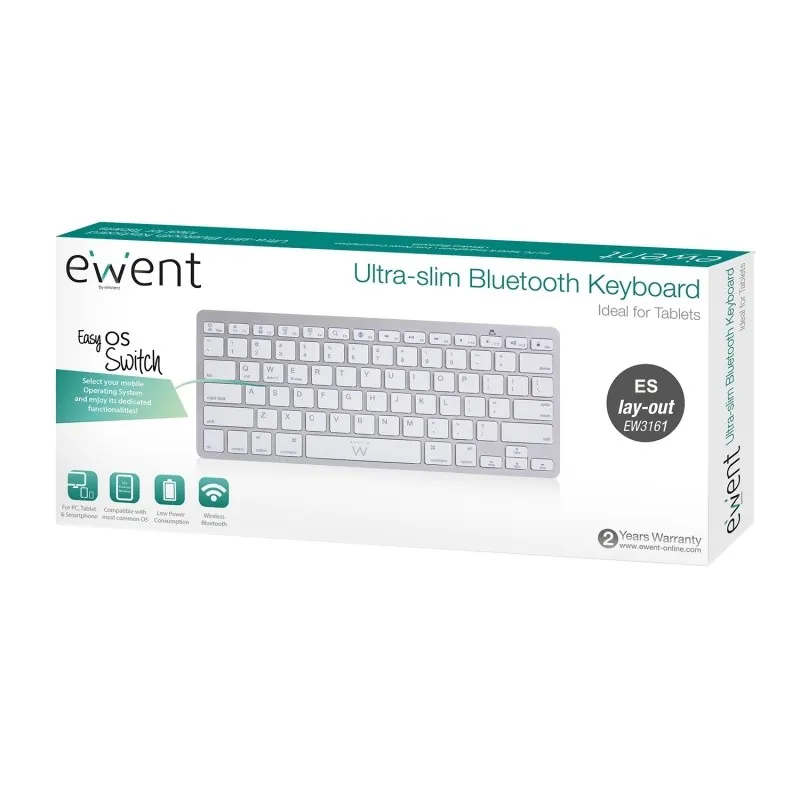 El teclado ultradelgado EW3161 Bluetooth está diseñado para escribir convenientemente en tabletas y teléfonos inteligentes. Se puede cambiar sin esfuerzo entre iOS, Mac OS, Android y dispositivos de Windows. El teclado está equipado con accesos directos multimedia adaptativos OS. El teclado de Bluetooth tiene un modo de ahorro de energía y se puede utilizar hasta 30 horas. El EW3161 es su compañero perfecto a escribir gracias al tiempo de espera de 40 días. El estado de la batería muestra el nivel de batería. Conectar el EW3161 fácilmente a su teléfono inteligente de la tableta con el botón de emparejamiento fácil