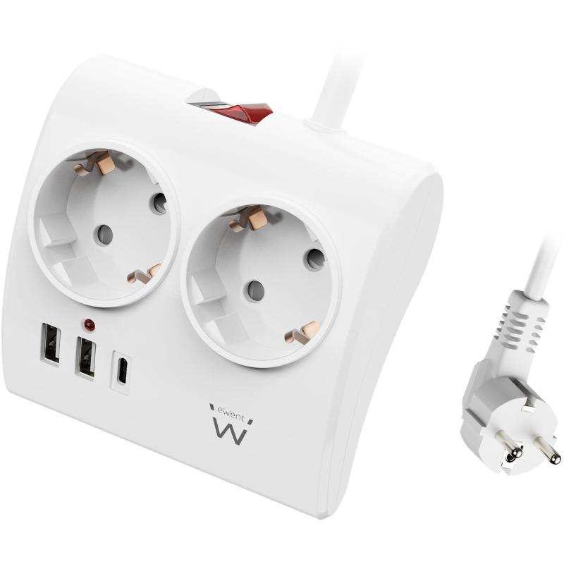 Ewent EW3870 Regleta 2 Tomas Schuko + x2 USB-A/x1 USB-C 1.5 Negro