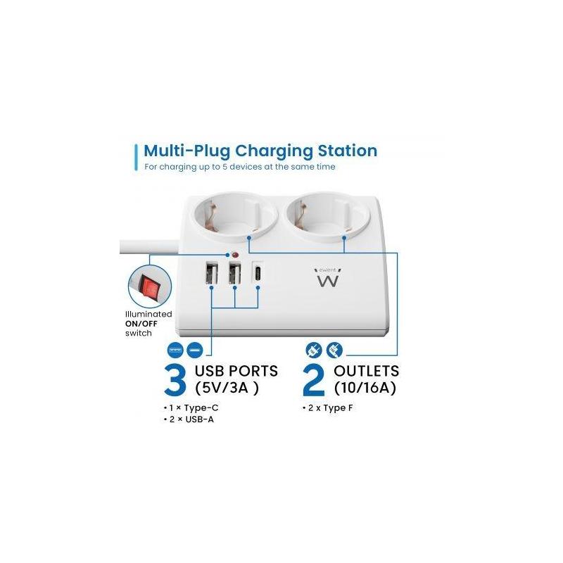 Regleta Ewent EW3870 con 3 enchufes y 3 puertos USB para una carga eficiente y segura. Esta regleta ha sido diseñada para ofrecer una solución práctica y versátil en el hogar u oficina, permitiendo conectar múltiples dispositivos de manera simultánea. Con tres salidas AC tipo F y tres puertos USB, proporciona una gran compatibilidad con diferentes aparatos electrónicos, desde ordenadores hasta teléfonos móviles y tablets.