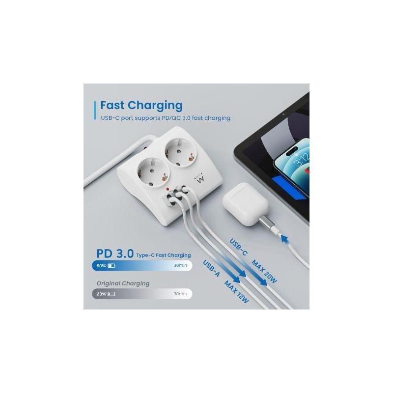2 TOMAS DE CORRIENTE Y 3 PUERTOS USB: La toma de corriente EW3870 tiene 2 tomas de corriente para conectar 2 dispositivos eléctricos/electrónicos. Los 2 puertos USB tipo A normales (5V/2.4A) y sobre todo 1 puerto USB tipo C (5V/3A, 9V/2.22A, 12V/1.66A) son adecuados para cargar las tabletas/teléfonos inteligentes y dispositivos electrónicos más modernos y actualizados. Los dos puertos USB tipo A son adecuados para cargar teléfonos inteligentes y tabletas con una carga máxima de 2,4 A a la vez, mientras que el puerto USB tipo C de última generación admite carga rápida (PD Quick Charge 3.0 – 20W)