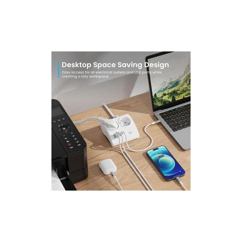 DISEÑO QUE AHORRA ESPACIO: El EW3870 cuenta con un diseño que ahorra espacio y ocupa solo un espacio limitado en su escritorio. Todas las tomas de corriente y puertos USB son fácilmente accesibles. Está equipado con un cable de 1,5 m de longitud. Además, el enchufe Schuko de 16 A, que ahorra espacio, está equipado con un ángulo de 90° que lo hace ideal para insertarlo en tomas de corriente presentes en espacios estrechos y estrechos.