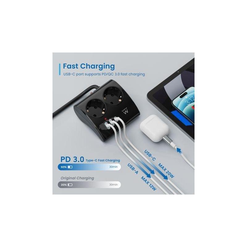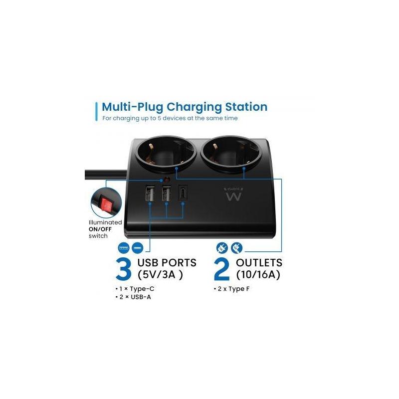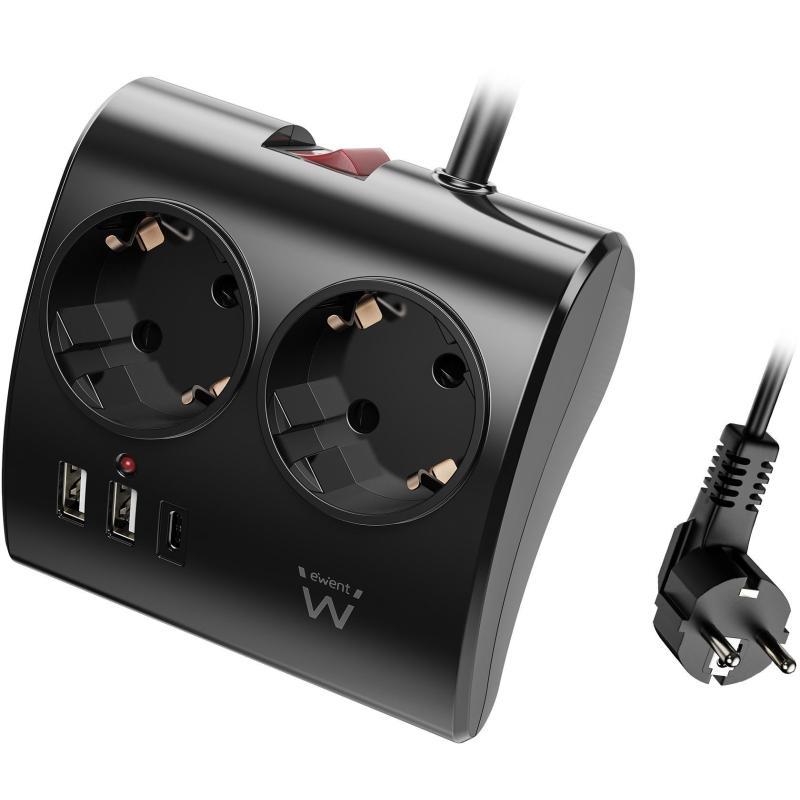 Ewent EW3871 Regleta 2 Tomas Schuko + x2 USB-A/x1 USB-C 1.5 Negro