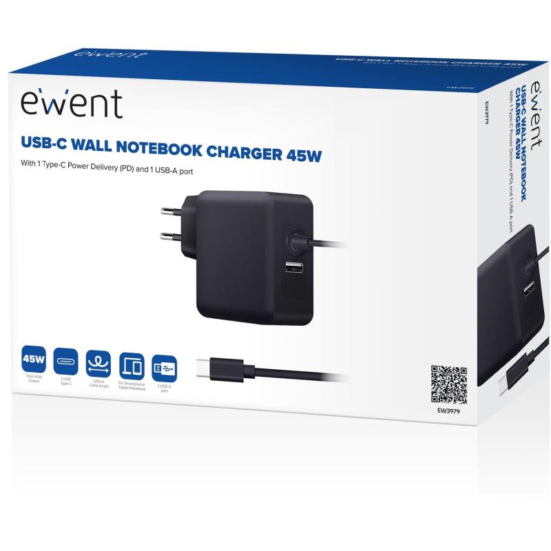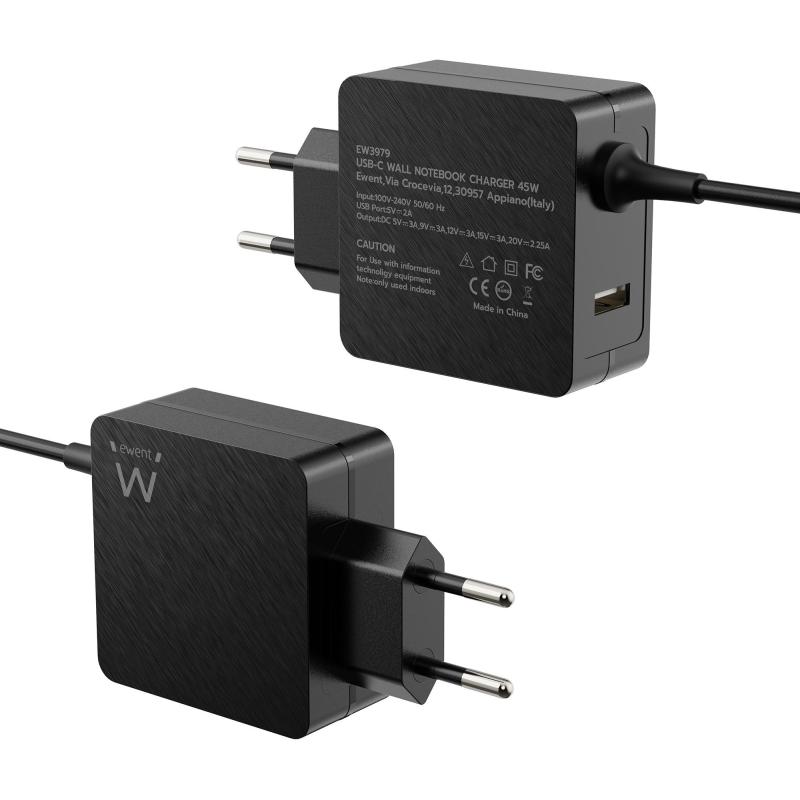 Ewent EW3979 Cargador para Portátil USB-C 45W + Puerto USB-A Negro