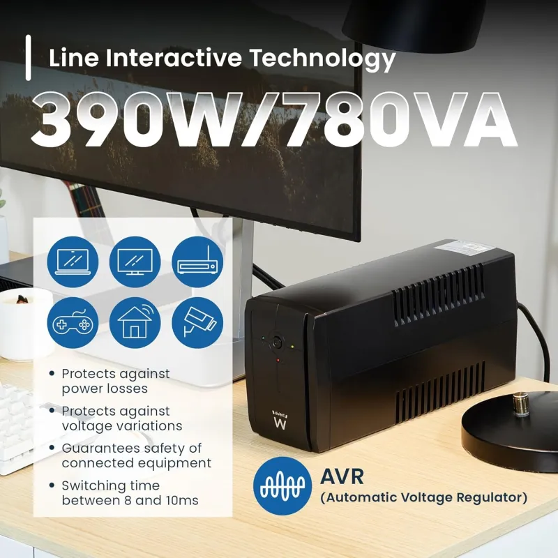 EWENT EW3995 SAI Interactivo 780VA (390W) Protección contra la Sobretensiones y Apagones , 10 minutos de Autonomía
