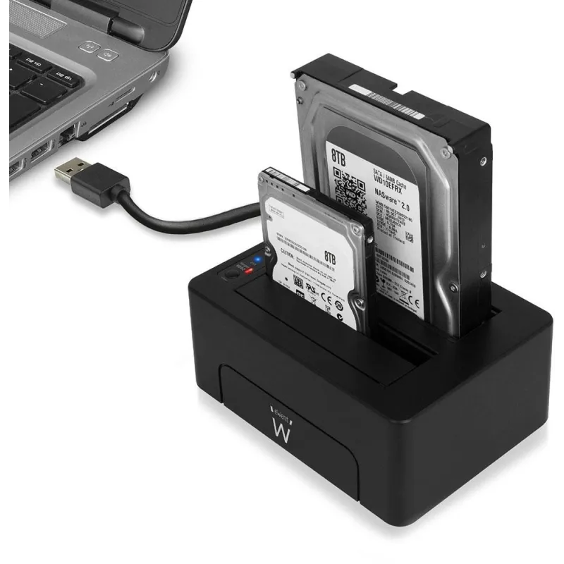 - Estación de acoplamiento dual para unidades de disco duro y unidades de estado sólido SATA de 2,5 y 3,5 de hasta 12,5 mm de grosor.
