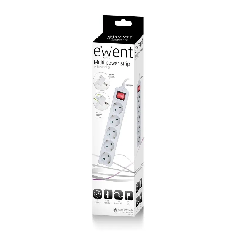 La Regleta EW3955 proporciona alimentación a sus dispositivos. Active o desactive los 5 dispositivos conectados al mismo tiempo con el interruptor de encendido/apagado con iluminación. El enchufe plano de ángulo recto está diseñado para ahorrar espacio. Puede colocar sus muebles aún más cerca de la pared. Extraiga el enchufe sin esfuerzo gracias al tirador especial. La regleta de alimentación incorpora protección para niños.