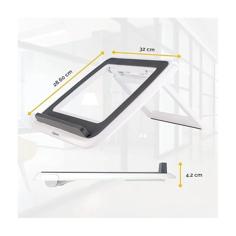 DIMENSIONES IDEALES PARA TU ENTORNO DE TRABAJO: Con un ancho de 320 mm, una profundidad de 286 mm y una altura de 420 mm, este soporte para portátil es compacto y ligero, con un peso de solo 800 g. Es el accesorio perfecto para tu entorno de trabajo, ya sea en casa o en la oficina.