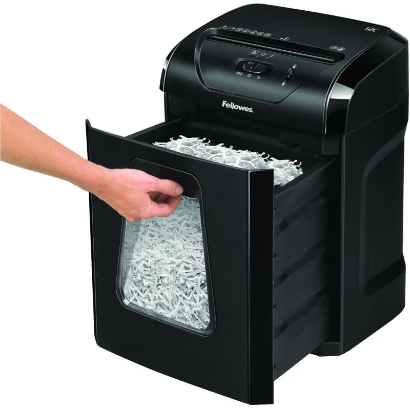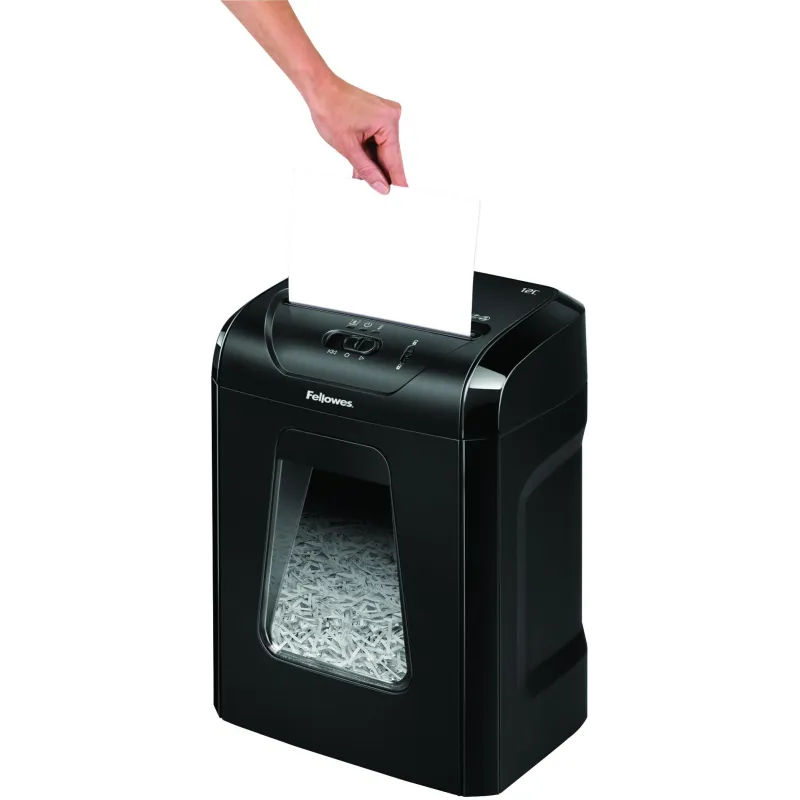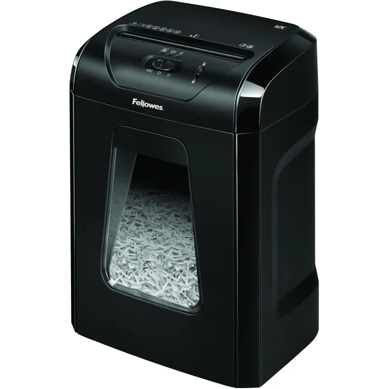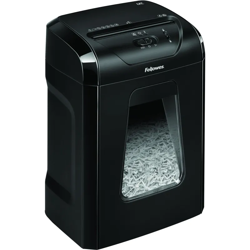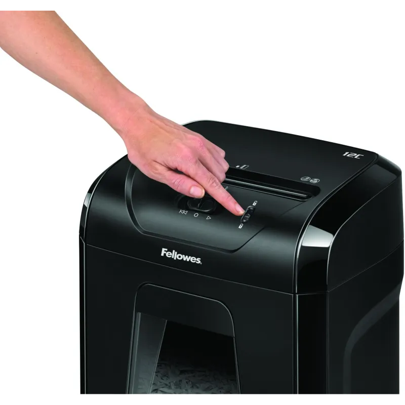 Destructora de papel Fellowes 12C negra 12 hojas y tarjetas, corte en partículas, papelera , sistema de seguridad para un uso doméstico y de oficina fluido.