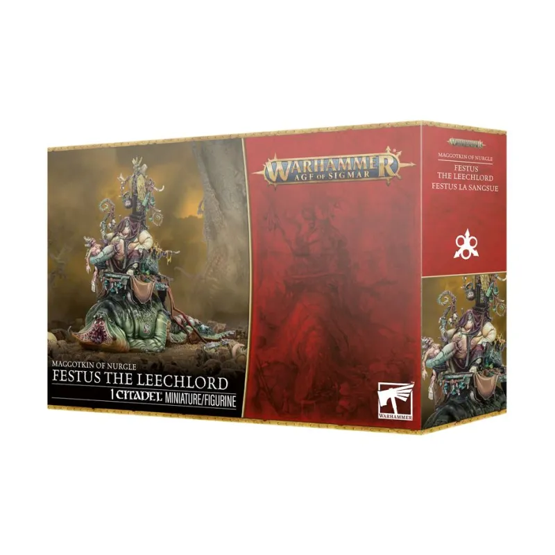 La caja corresponde a la facción Maggotkin of Nurgle e identifica el personaje como Festus the Leechlord, lo que facilita integrarlo en listas temáticas y en colecciones centradas en Nurgle.