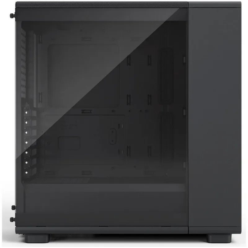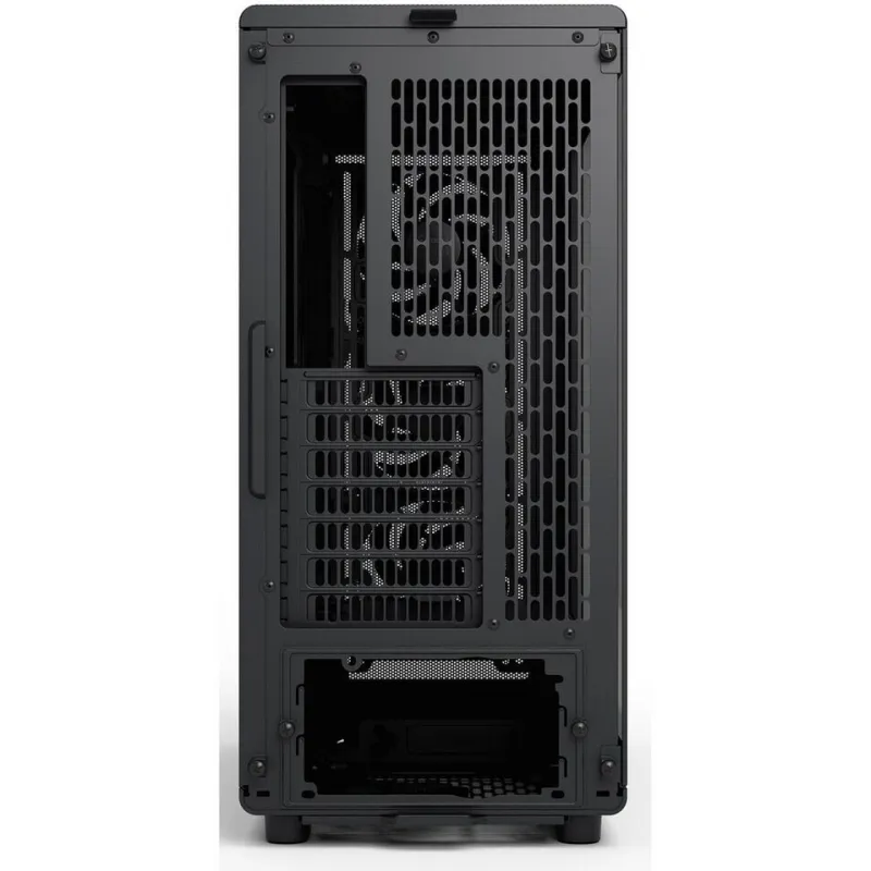 El rasgo central del chasis es su combinación de estructura amplia con panel lateral de cristal templado tintado. Este cristal permite ver el interior del equipo, pero el tintado ligero ayuda a suavizar el impacto visual de cables o componentes cuando el PC está apagado. Unido al acabado en negro, el conjunto encaja bien en escritorios domésticos, oficinas y setups visibles en streaming.