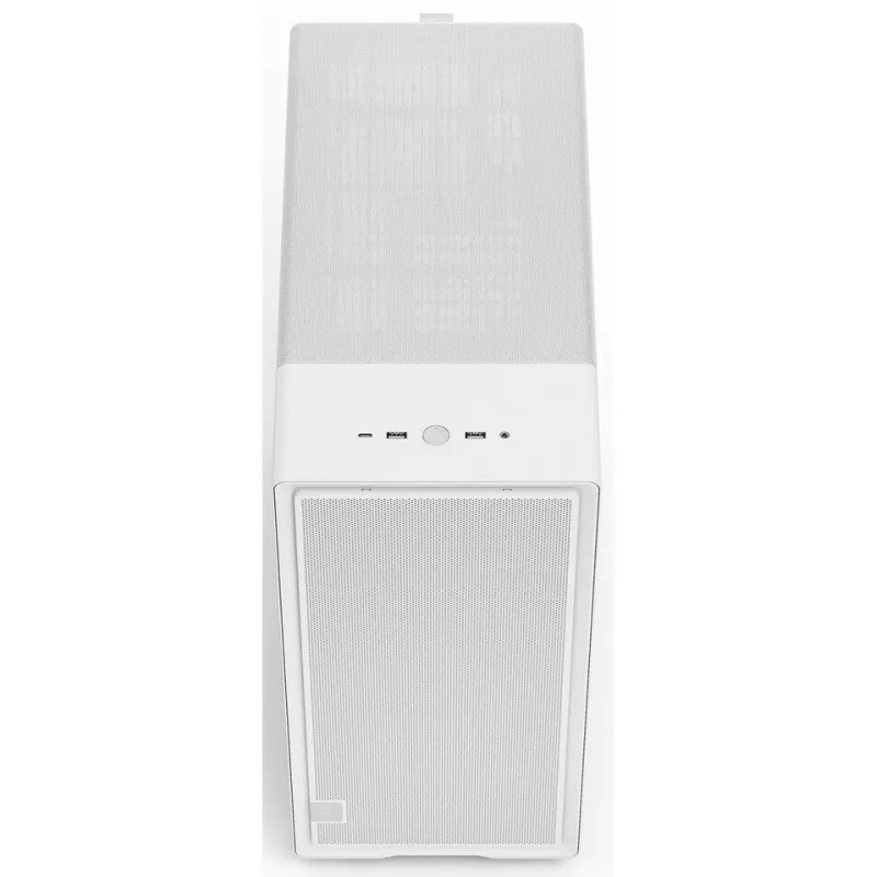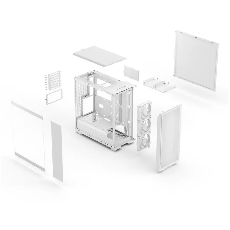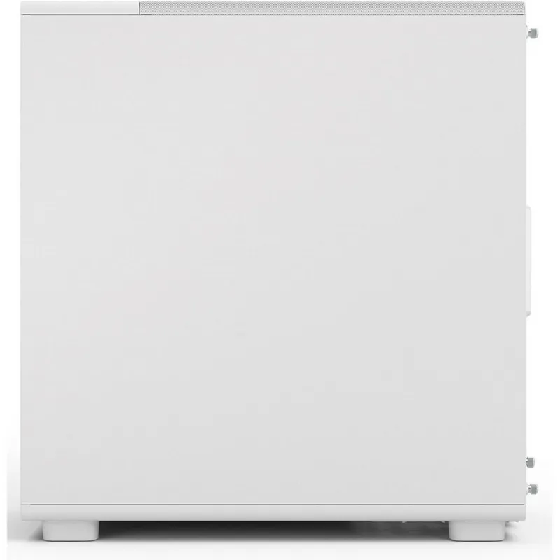 El panel lateral de vidrio templado con tinte claro permite ver el interior sin perder rigidez estructural, de modo que puedes enseñar la iluminación de ventiladores y componentes manteniendo una apariencia limpia y consistente con el exterior en color blanco.
