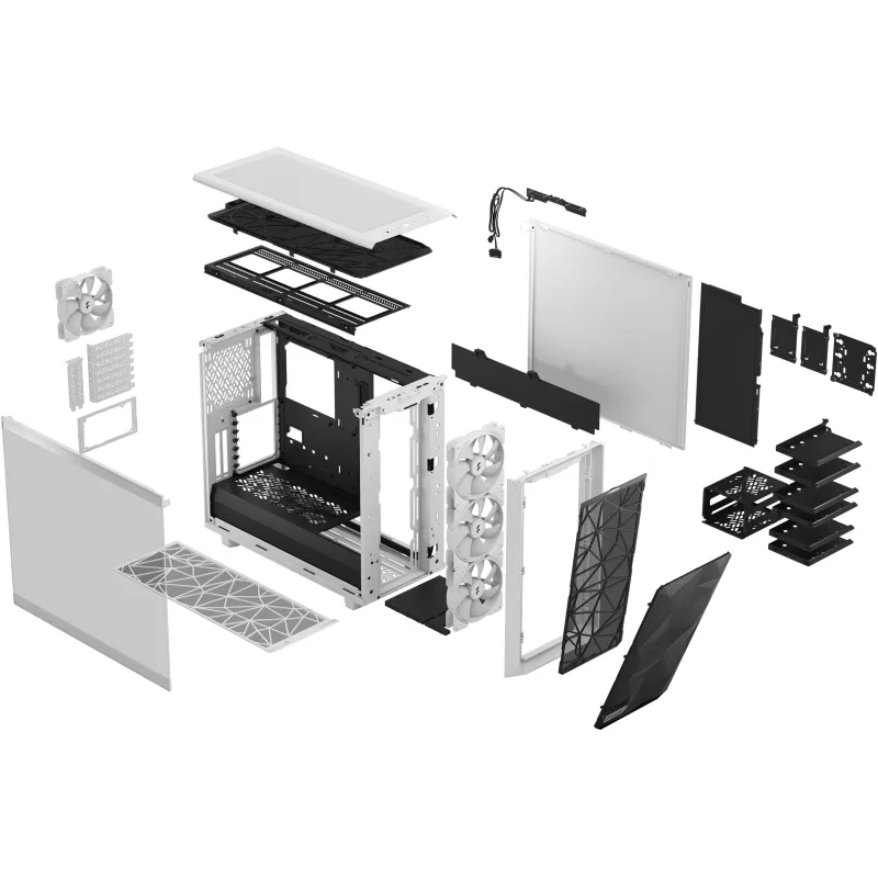 Para un rendimiento térmico óptimo, la Torre Fractal Design Meshify 2 RGB incorpora ventiladores de 140 mm preinstalados: tres en el frontal y uno en la parte trasera. Además, admite múltiples configuraciones de refrigeración líquida con soporte para radiadores de hasta 360 mm en la parte frontal y superior. Esta torre permite instalar hasta nueve tarjetas de expansión, lo que la convierte en una opción excelente para sistemas de alto rendimiento. También cuenta con puertos USB 3.2 Gen 1 tipo A y USB 3.2 Gen 2 tipo C, junto con entrada y salida de audio, ofreciendo conectividad moderna y rápida. Su interior espacioso admite tarjetas gráficas de hasta 45 cm y disipadores de CPU de hasta 18,5 cm de altura. Todo ello en un chasis de color blanco que destaca por su diseño limpio y profesional.