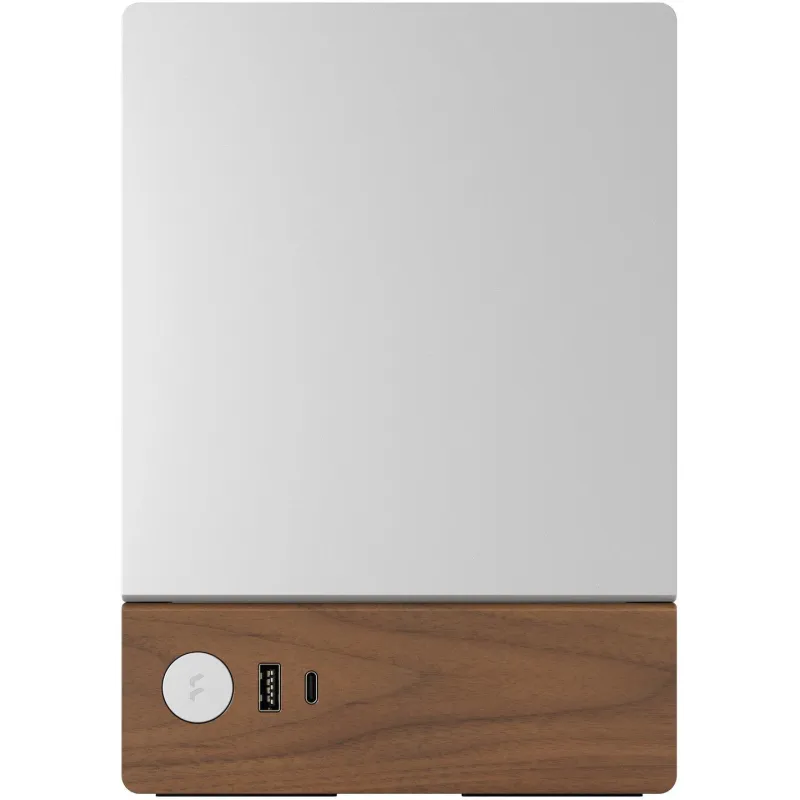 I/O FRONTAL: El panel frontal de nogal macizo cuenta con un botón de encendido de aluminio y dos puertos USB para conectar dispositivos, incluyendo un USB Tipo-C de 20Gbps