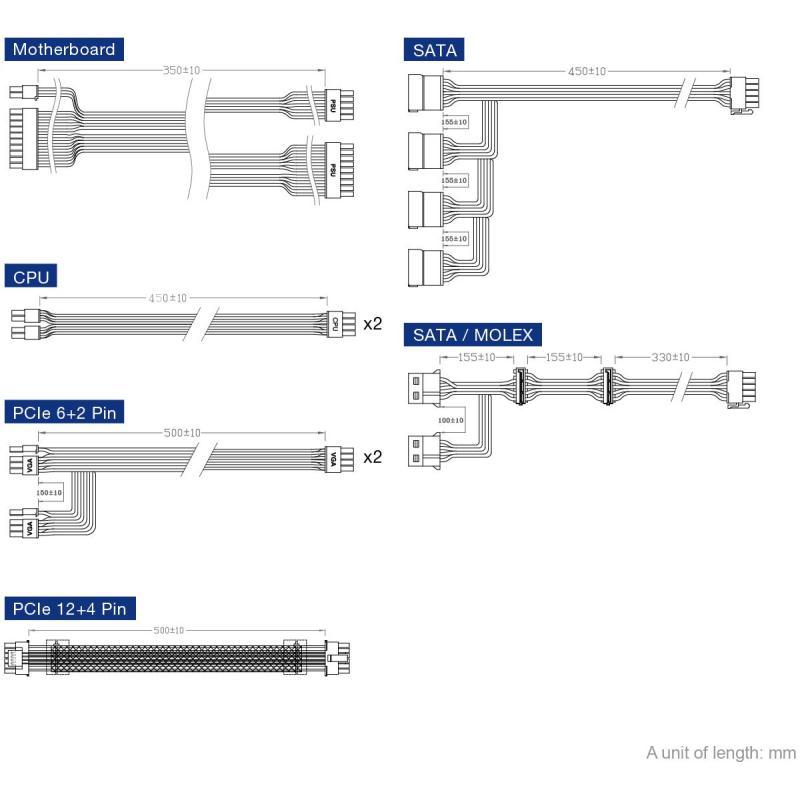 - Longitud del cable de conectores de alimentación PCI Express (12+4 pines): 500 mm