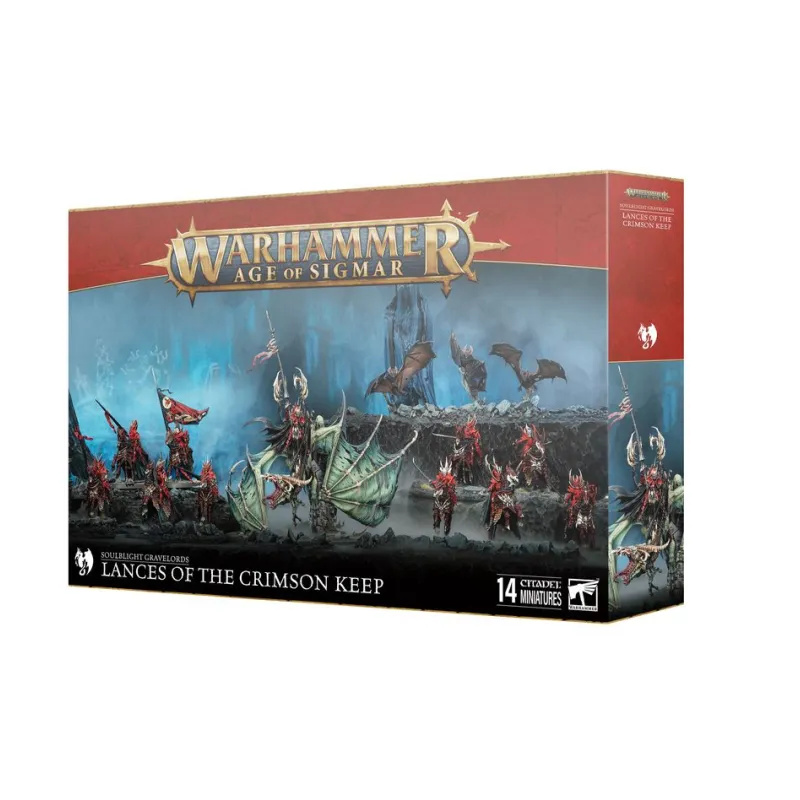 Diferenciadores: selección centrada en Lanzas de la Torre Carmesí con fuerte identidad visual, combinación equilibrada de héroes y caballería de élite en una sola caja, producto oficial diseñado para Age of Sigmar Soulblight Gravelords sin mezclas de facciones.