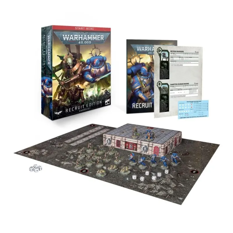 Si quieres empezar en Warhammer 40,000 sin complicarte, el set Recruit Edition 2020 de Games Workshop te da en una sola caja todo lo necesario para jugar tus primeras partidas, con miniaturas de Space Marines y Necrones en plástico y un reglamento básico pensado para aprender paso a paso.