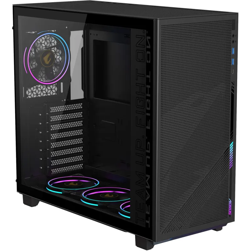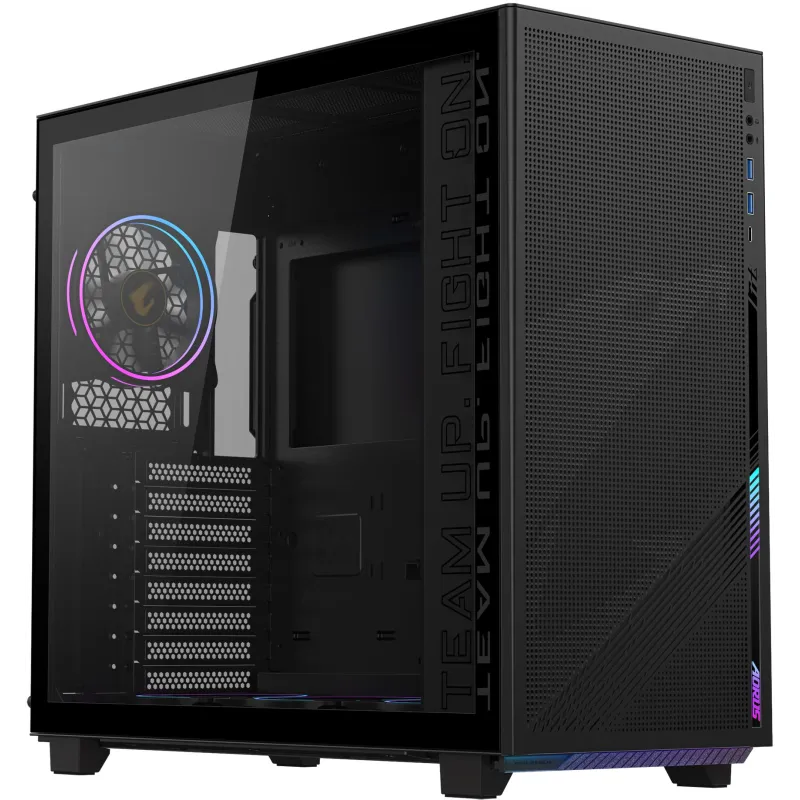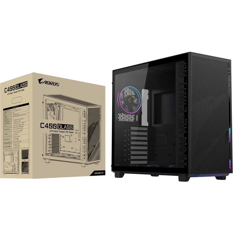 Torre de PC Gigabyte AORUS C400 Glass RGB Negro con formato Midi Tower, ventana de cristal templado e iluminación. Compatible con ATX, micro ATX y Mini-ITX.