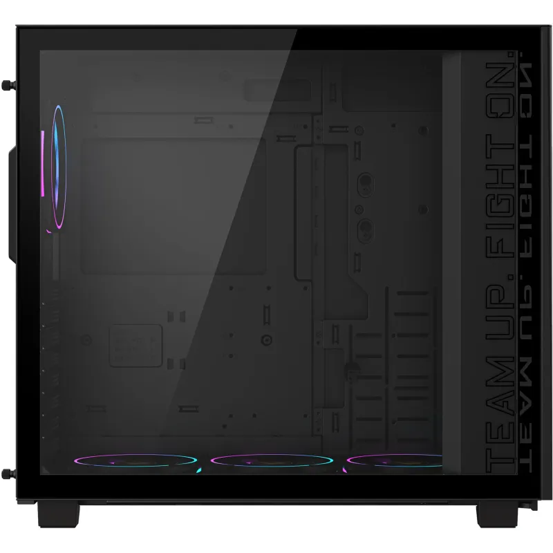 La ventana lateral y el material de cristal templado dejan a la vista componentes y cableado, con acabado negro.