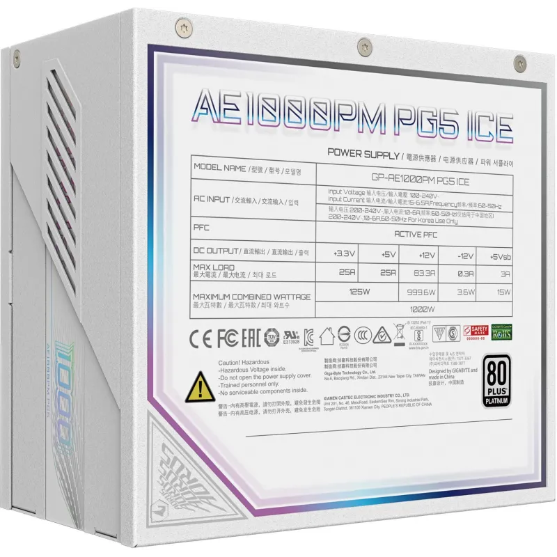 La fuente de alimentación Gigabyte Aorus Elite ofrece un rendimiento excepcional con una potencia total de 1000 W y una eficiencia del 92%, asegurando un consumo energético óptimo. Diseñada para soportar un rango de voltaje de 100 - 240 V y una frecuencia de 50/60 Hz, se adapta perfectamente a diversas configuraciones de PC. Gracias a su certificación 80 PLUS Platinum, garantiza una eficiencia energética superior, mientras que su diseño totalmente modular facilita una instalación limpia y organizada.
