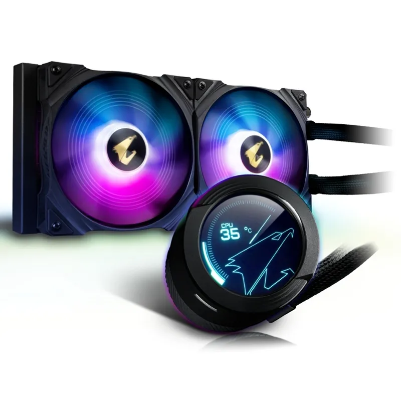 El Gigabyte Aorus WaterForce X 280 tiene un radiador de 280 mm que se encarga de disipar el calor generado por tu CPU. Además, cuenta con dos ventiladores de 140 mm con iluminación RGB que puedes personalizar a tu gusto. El bloque de agua tiene un aspecto elegante y una pantalla LCD que te muestra información útil como la temperatura, la velocidad del ventilador y el logo de Aorus.