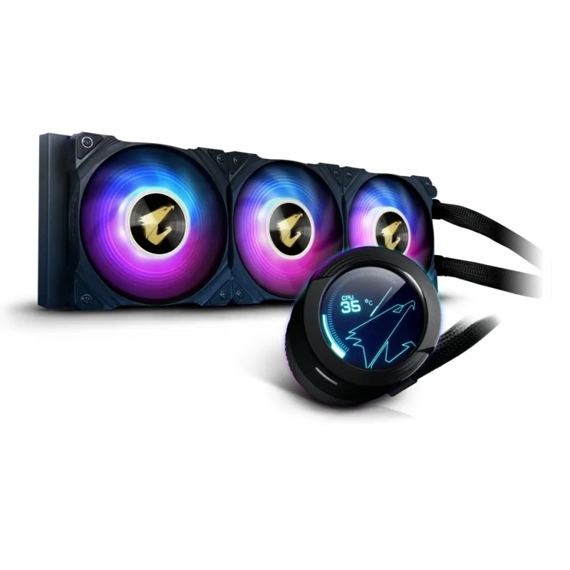 El Gigabyte Aorus WaterForce X 360 cuenta con un radiador de 360 mm que disipa el calor de forma eficiente y silenciosa. Además, tiene tres ventiladores de 120 mm con iluminación RGB personalizable que crean un espectáculo de luces en tu torre. El bloque de agua tiene un diseño elegante y una pantalla LCD que muestra la temperatura, la velocidad del ventilador y el logo de Aorus.