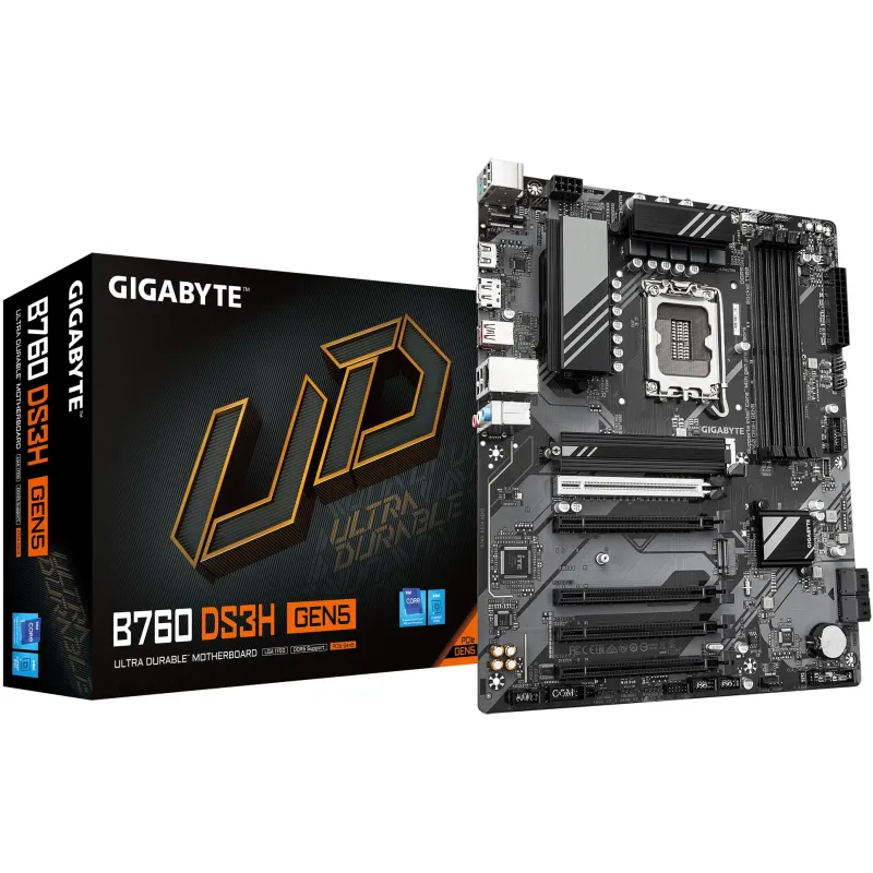 RENDIMIENTO POTENTE CON COMPATIBILIDAD INTEL DE ÚLTIMA GENERACIÓN La Placa Base Gigabyte B760 DS3H GEN5 es compatible con una amplia gama de procesadores Intel, desde los modelos Celeron hasta los potentes Core i9 de 14ª generación. Gracias a su socket LGA 1700 y al chipset Intel B760 Express, esta placa base garantiza una integración perfecta y un rendimiento optimizado. Su arquitectura está diseñada para ofrecer estabilidad y eficiencia en todo momento, permitiendo al usuario sacar el máximo partido a su hardware. Es ideal tanto para usuarios domésticos como para profesionales que necesitan una base robusta para sus sistemas informáticos.