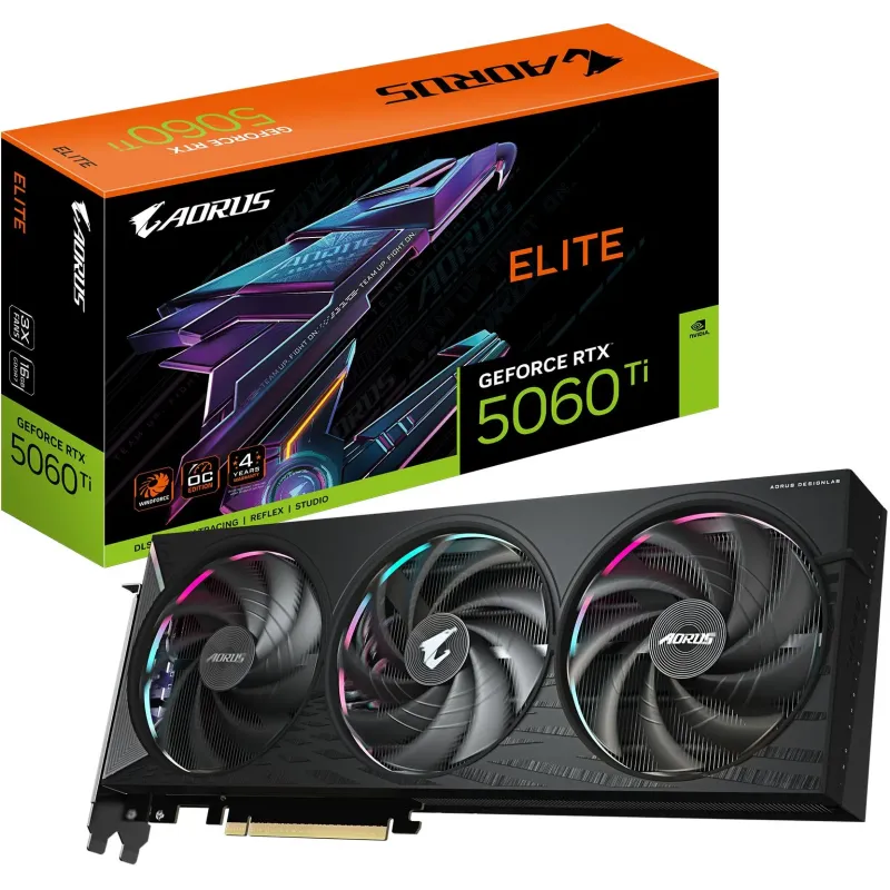 Tarjeta Gráfica Gigabyte GeForce RTX 5060 Ti AORUS ELITE 16G con 16 GB GDDR7 triple ventilador WINDFORCE 3X y resolución 8K