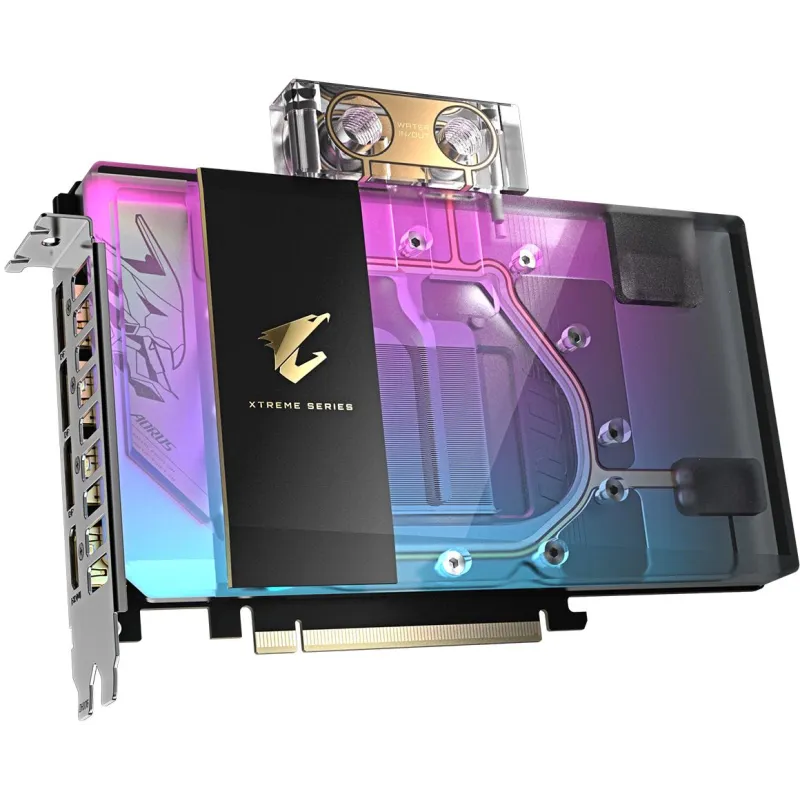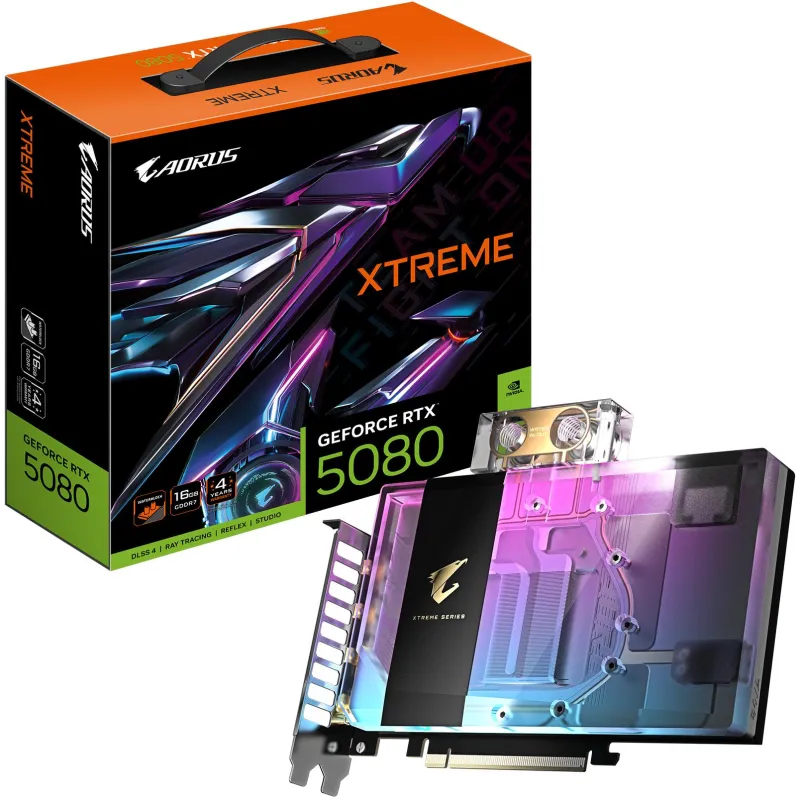 Gráfica Gigabyte GeForce RTX 5080 AORUS XTREME WATERFORCE WB con memoria GDDR7 16 GB, frecuencia de 2805 MHz y soporte para 4 pantallas