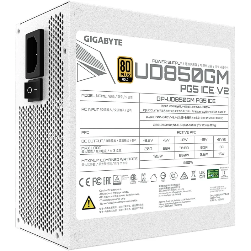 Fuente de Alimentación Gigabyte UD850GM PG5 V2 ICE  formato ATX 3.1 , con certificación 80 PLUS Gold, fuente de alimentación totalmente modular y 850 W