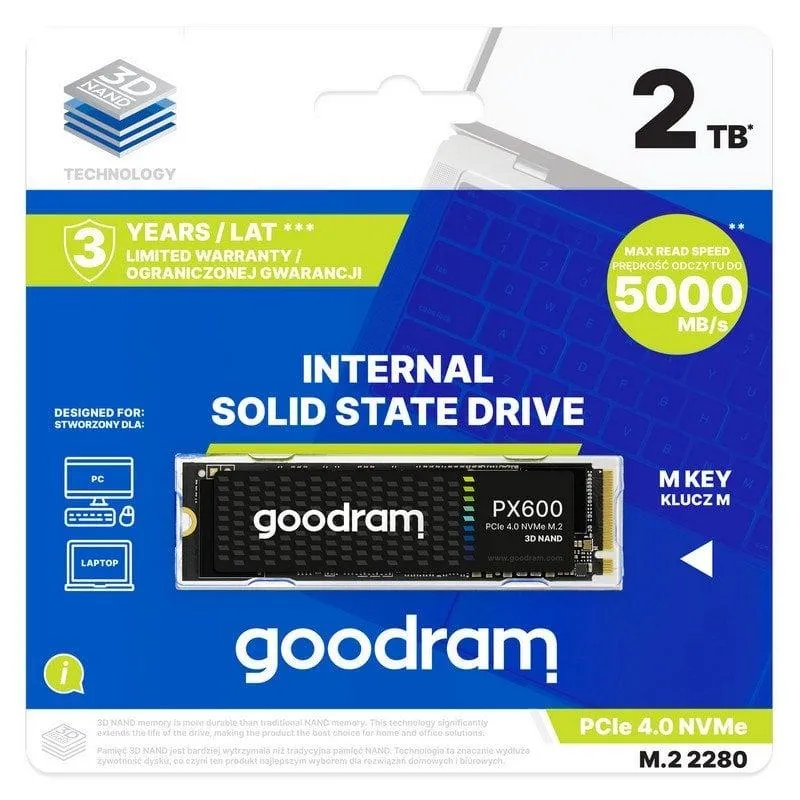 MÚLTIPLES CAPACIDADES EN UNA SOLA UNIDAD: El Goodram PX600 está disponible en varias capacidades: 250 GB, 500 GB, 1.000 GB y 2.000 GB, todas ellas en formato M.2 2280 con colocación de componentes por una sola cara. Como otros SSD del fabricante polaco, el PX600 está cubierto por una garantía de 3 años*.