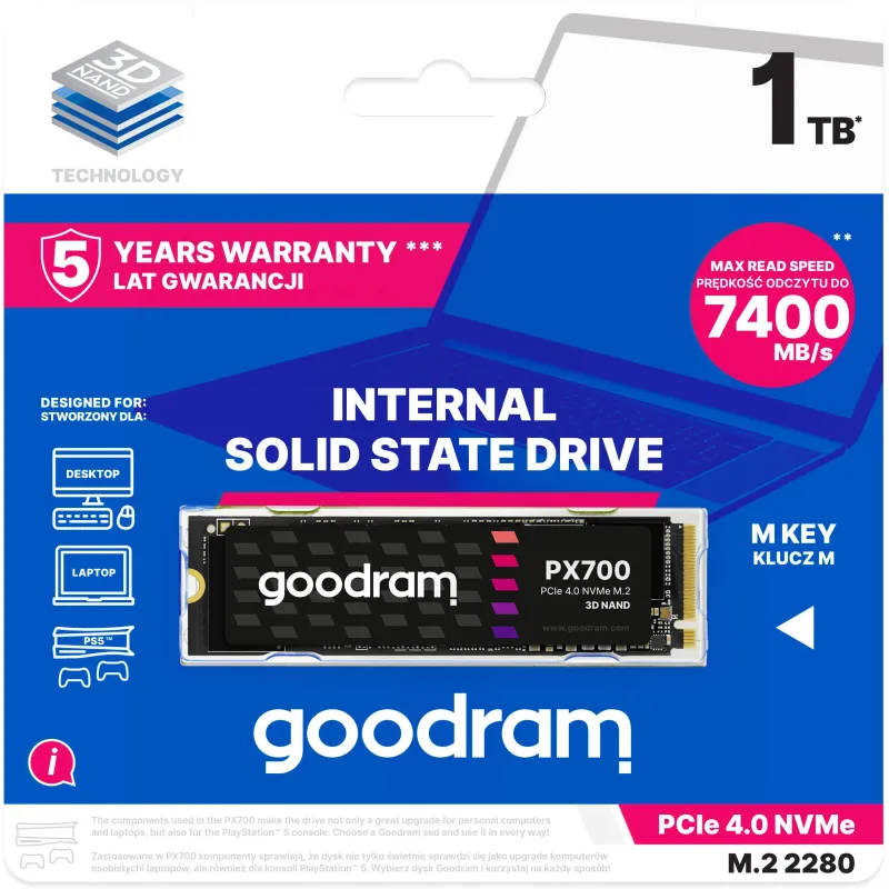 El nuevo Goodram PX700 es ideal para los usuarios que desean aumentar el rendimiento y la capacidad de respuesta de su ordenador o portátil. También es ideal para los jugadores que necesitan más espacio para datos y juegos en su consola PlayStation™. Las fulgurantes velocidades de lectura y escritura de la unidad PX700 se traducen directamente en un rendimiento fluido, una carga rápida de juegos y aplicaciones, y operaciones más rápidas. Las altas velocidades de lectura y escritura son casi el doble que las de la anterior generación de unidades, y además la velocidad de la última solución de Goodram utiliza las máximas capacidades de la cuarta generación de unidades.