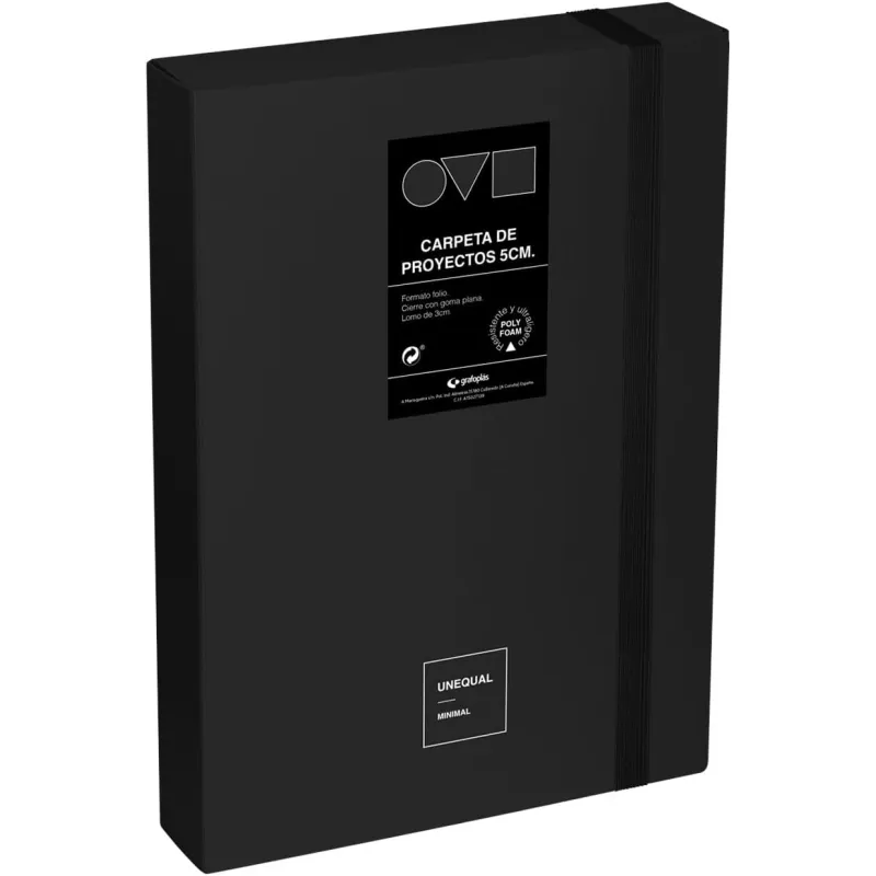 Beneficios clave: material polyfoam, lomo de 5 cm, color negro, diseño Unequal Minimal, acabado minimalista, marca Grafoplás, uso para proyectos y documentos, formato caja de proyectos