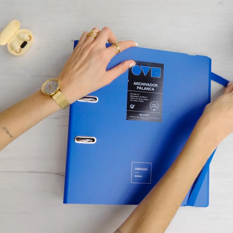 Este archivador A4 con lomo de 65 mm, material Polyfoam y color azul pertenece a la línea Unequal Minimal de Grafoplás. Es una base sólida para crear un sistema de archivo claro y repetible. Si tu prioridad es estandarizar por formato y color, y concentrar proyectos en menos unidades, esta referencia ofrece una combinación directa y fácil de replicar en el tiempo.