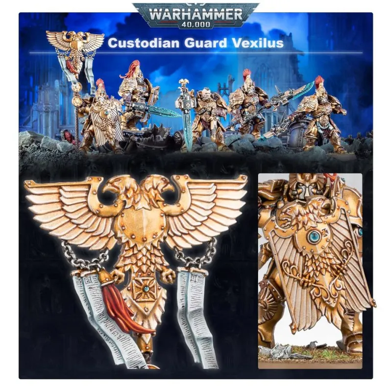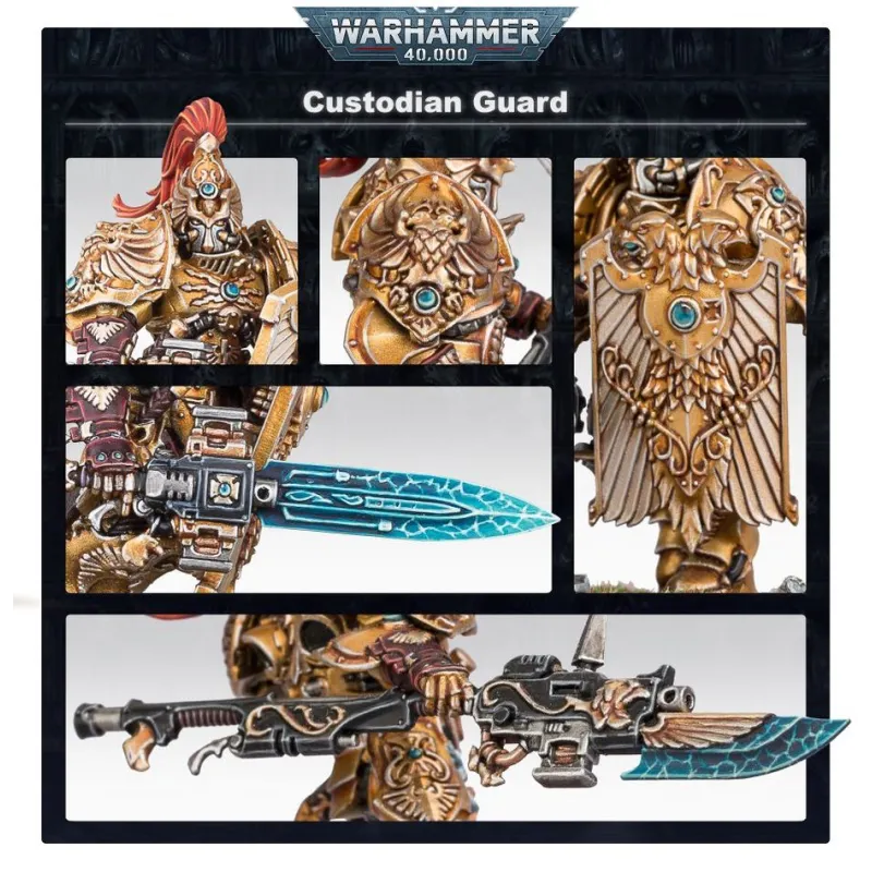 A nivel de lista, los Guardias Custodios se integran bien con personajes de apoyo, vehículos y otras unidades de la facción. Puedes usarlos como escolta de personajes clave, como ancla defensiva en tu zona o como punta de lanza según el armamento elegido, encajando tanto en listas más competitivas como en colecciones temáticas.
