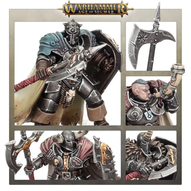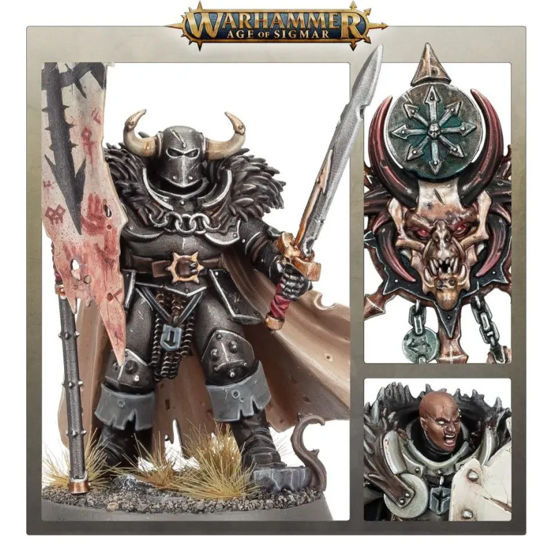 El diseño de armaduras, cascos y estandartes recupera el aspecto clásico de los Guerreros del Caos pero actualizado a la línea moderna de Age of Sigmar, creando una unidad que destaca en mesa y que funciona muy bien como lienzo para esquemas de pintura personalizados y combinaciones de metales y tonos oscuros.