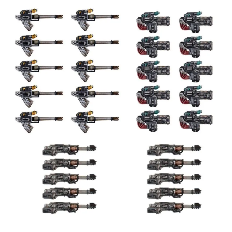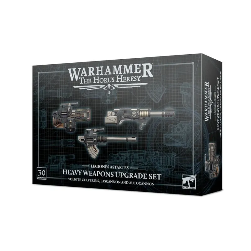 El núcleo del set son las armas pesadas icónicas de la era de la Herejía: los volkite culverins aportan un volumen alto de disparos contra infantería, los cañones láser ofrecen disparos de alta potencia contra blindados y objetivos duros, y los autocañones equilibran cadencia y fuerza. Combinados, permiten diseñar escuadras especializadas para cubrir distintos roles tácticos sin cambiar de gama ni de estética.