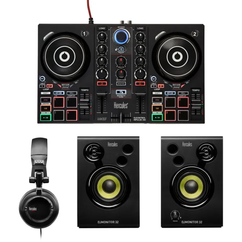 HERCULES DJLEARNING KIT ES EL KIT TODO EN UNO PERFECTO: Hercules DJLearning Kit MK2 es el kit todo en uno perfecto para comenzar como DJ. Incluye el controlador DJControl Inpulse 200, altavoces de monitoreo DJMonitor 32 y auriculares HDP DJ45. ¡Es el regalo definitivo para cualquiera que quiera empezar a mezclar, mejorar sus habilidades y realmente convertirse en DJ! Hercules DJLearning Kit viene con la versión completa del software DJUCED para el controlador DJControl Inpulse 200. ¡Los tutoriales en video de la Hercules DJ Academy integrados en el software DJUCED hacen que aprender a mezclar sea más fácil y divertido que nunca!