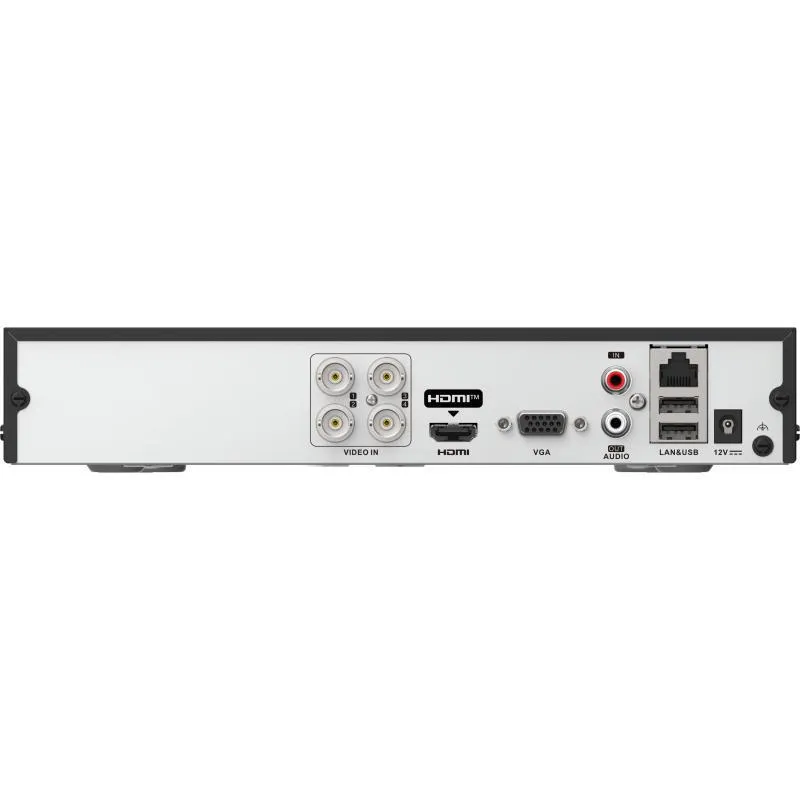 Beneficios clave: 4 canales de entrada de video, compresión H.265/H.265+, salida HDMI, salida VGA, conectividad Ethernet, interfaz HDD SATA, soporta 1 HDD, detección de movimiento, 1 puerto RJ-45, 2 USB, resolución máxima Full HD 1920 x 1080, rango operativo -10 a 55 °C