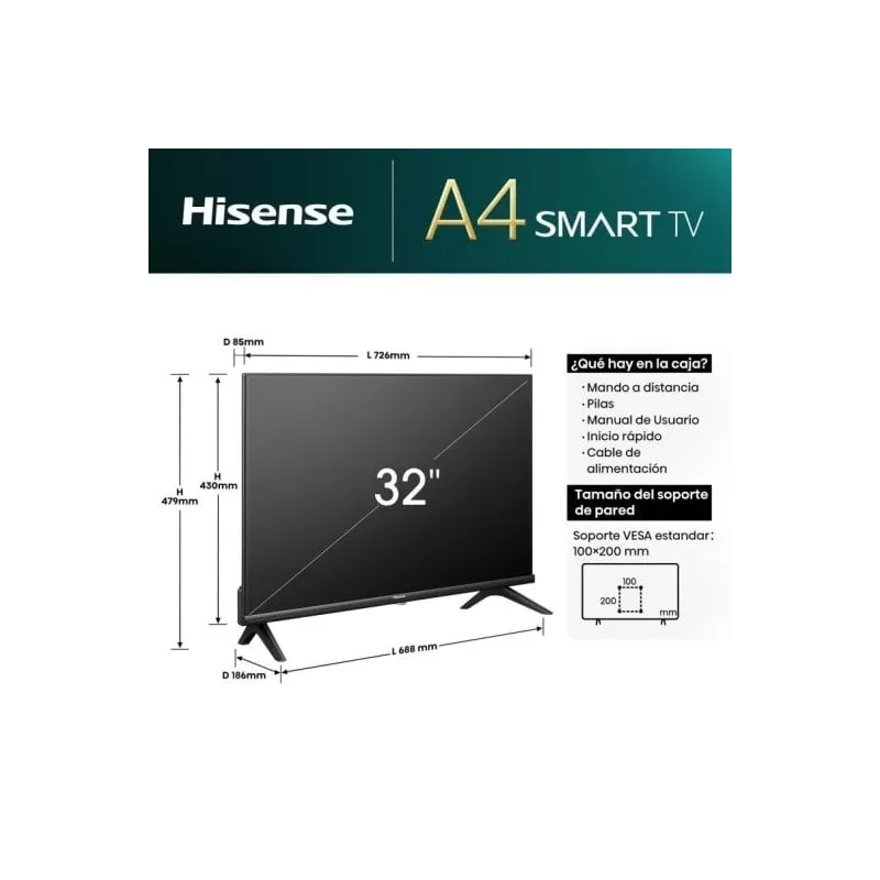 Televisor Hisense 32A4N 32" LED HD Ready 1366 x 768 Smart TV WiFi 4 Ethernet 2 Altavoces