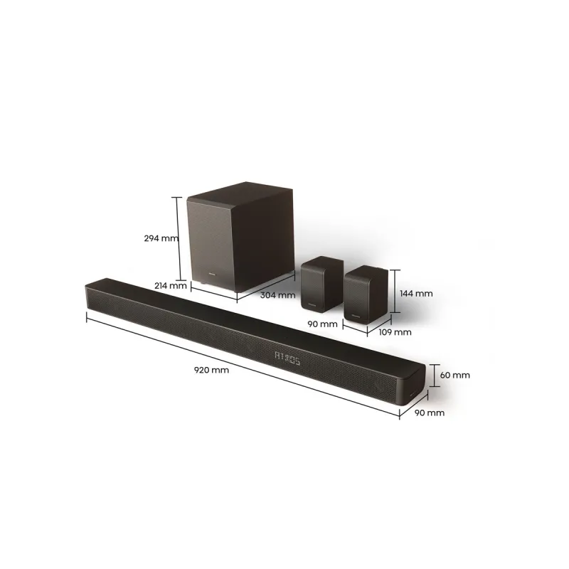 El diseño en color negro y las dimensiones compactas de la barra de sonido (920 mm de ancho, 90 mm de profundidad, 60 mm de altura) y del subwoofer (21,4 cm de ancho, 30,4 cm de profundidad, 29,4 cm de altura) permiten una fácil instalación y discreta presencia en tu hogar. Todo esto, junto con un mando a distancia y una guía de configuración rápida, asegura una experiencia de uso intuitiva y completa.