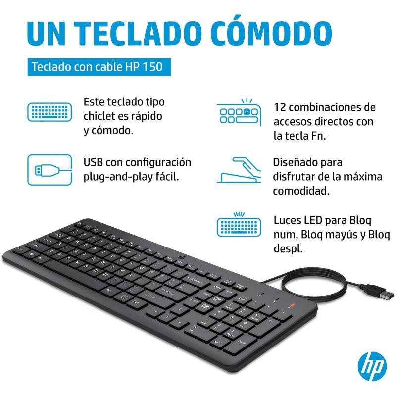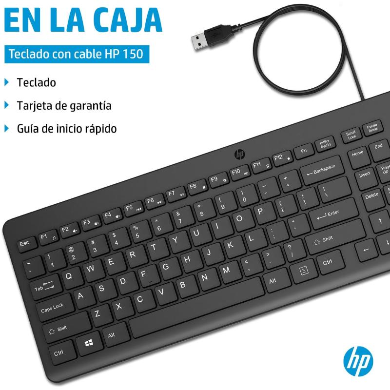 Teclado HP con cable 150 diseño ergonómico conexión USB alámbrica teclado numérico, color Negro