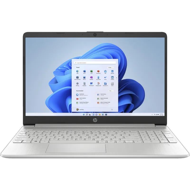 El portátil HP en plata natural destaca por su diseño elegante y moderno con base y cubierta con acabado pintado, marco del teclado con patrón de cepillado vertical y funda de silicona, ideal para el uso diario. Su pantalla de 15.6" Full HD con tecnología Micro-Edge y antirreflectante ofrece una experiencia visual inmersiva y clara.