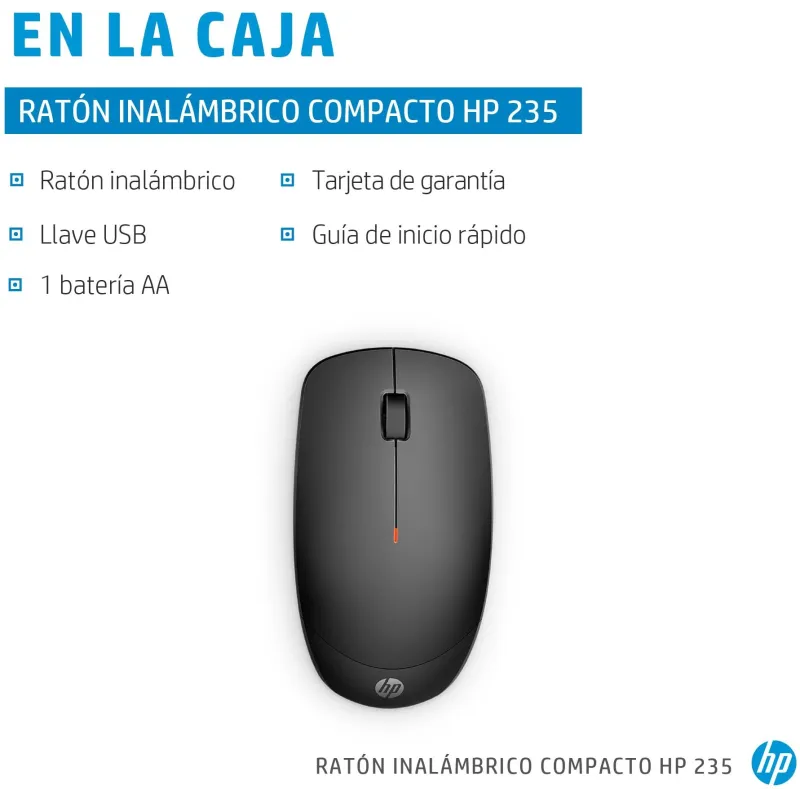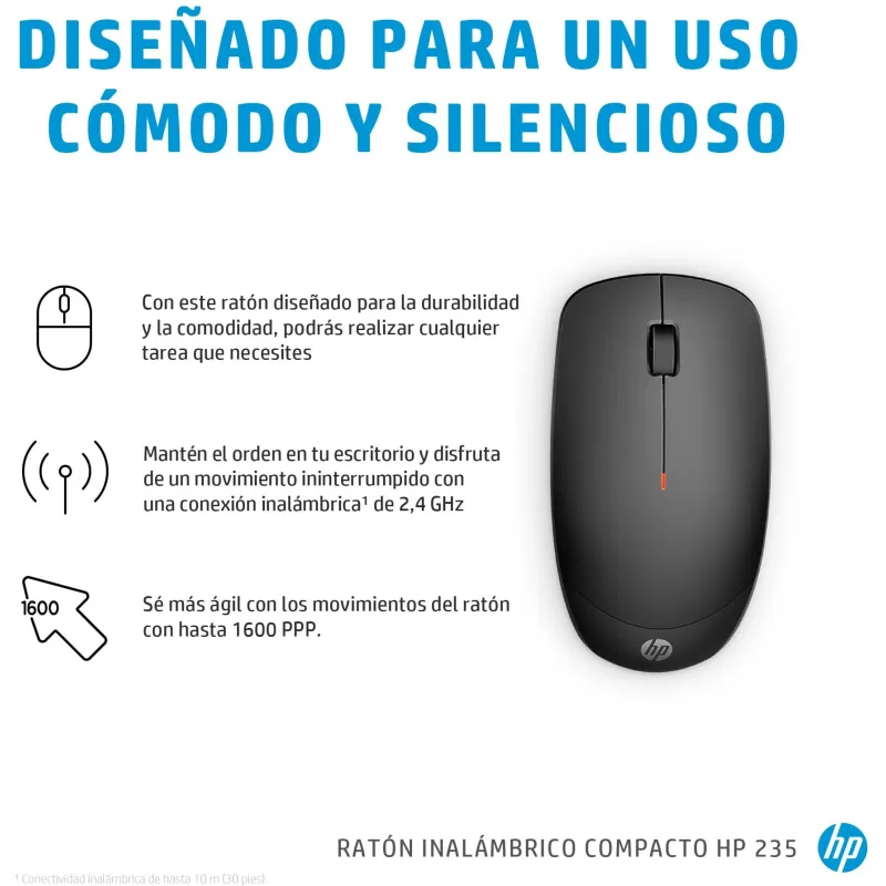 Ratón HP inalámbrico compacto 235 con resolución 1600 DPI, tecnología de sensor óptico, diseño ambidiestro y alcance inalámbrico de 10 m