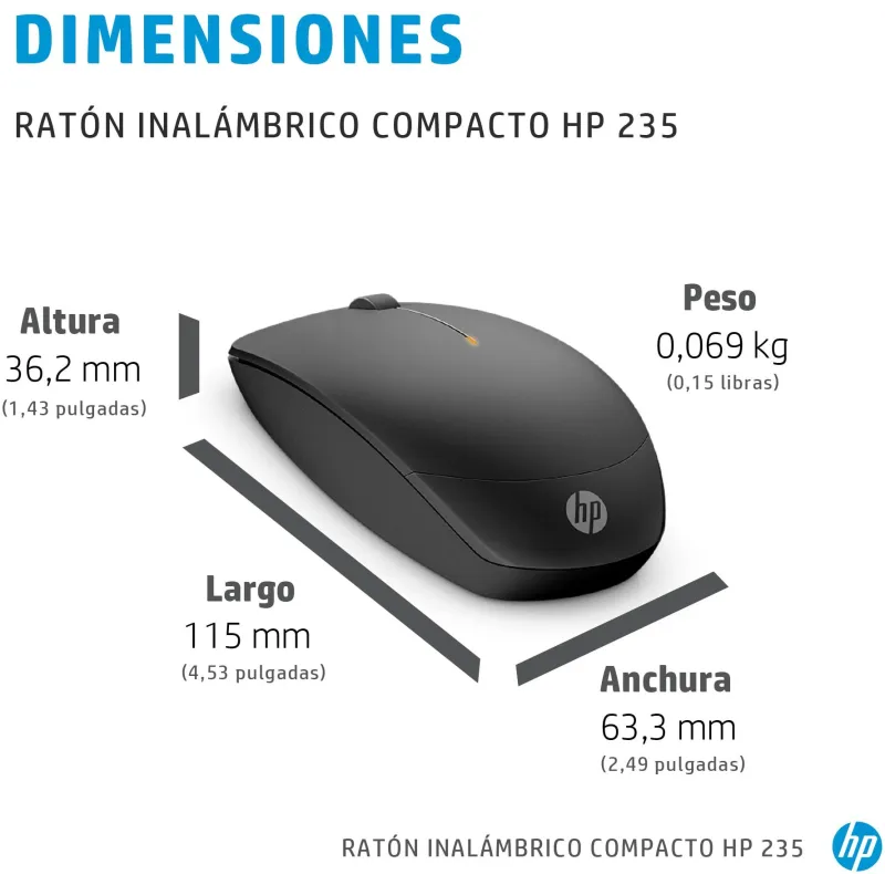 Ratón Compacto Ambidiestro HP 235  con resolución 1600 DPI, tecnología de sensor óptico, diseño ambidiestro y alcance inalámbrico de 10 m