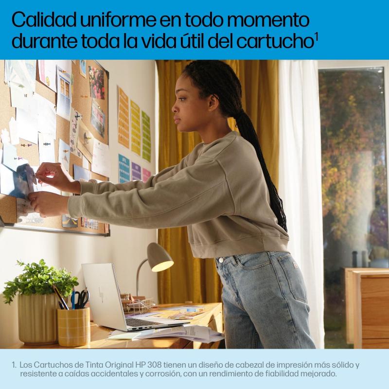 Cartucho de tinta HP 308 7FP21UE de alto rendimiento compatible con impresoras HP Envy imprime hasta 160 páginas con calidad profesional.