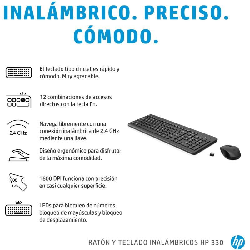 Teclado y Ratón HP 330 diseño ergonómico conectividad RF teclado numérico y ratón ambidiestro, color Negro