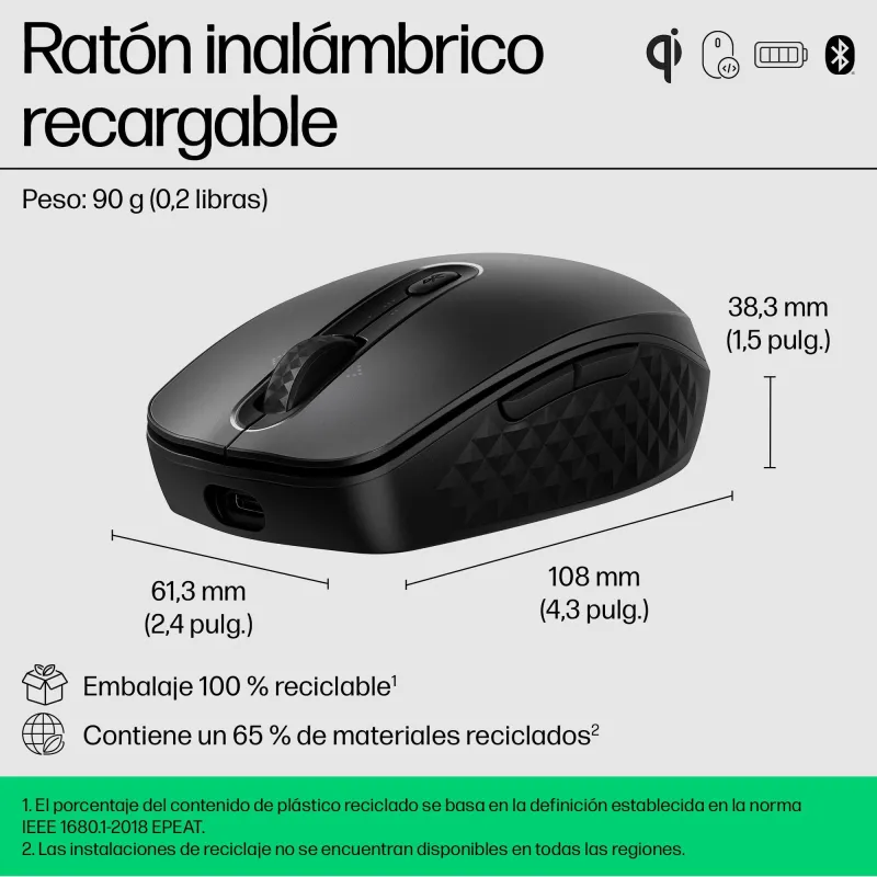 Una de las características destacadas del Ratón inalámbrico recargable HP 690 Negro es su batería integrada de ion de litio, que ofrece una autonomía de hasta 4 meses con una sola carga. Esta batería es recargable mediante puerto USB tipo C, lo que facilita su uso continuo sin necesidad de cambiar pilas. El ratón también incluye tecnología de botones presionados y una rueda de desplazamiento precisa, lo que mejora la navegación y el control en tareas cotidianas o profesionales. Con un peso de tan solo 88,7 gramos, es ligero y cómodo de transportar. Además, cuenta con certificaciones de conformidad internacionales, lo que garantiza su fiabilidad y seguridad. Este modelo está pensado para el segmento doméstico, pero cumple con las exigencias de un entorno profesional gracias a su rendimiento y durabilidad.