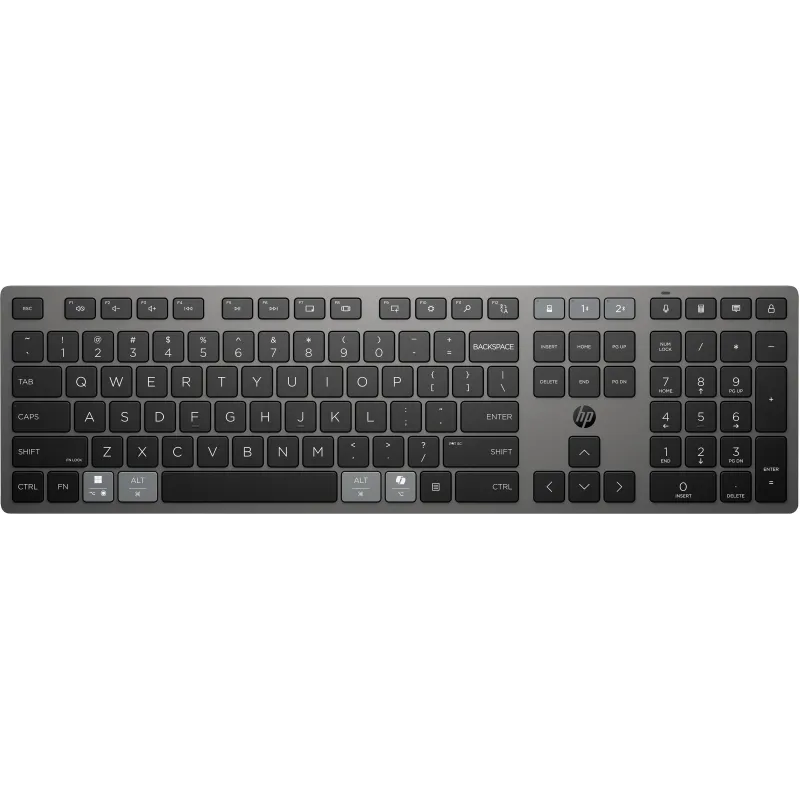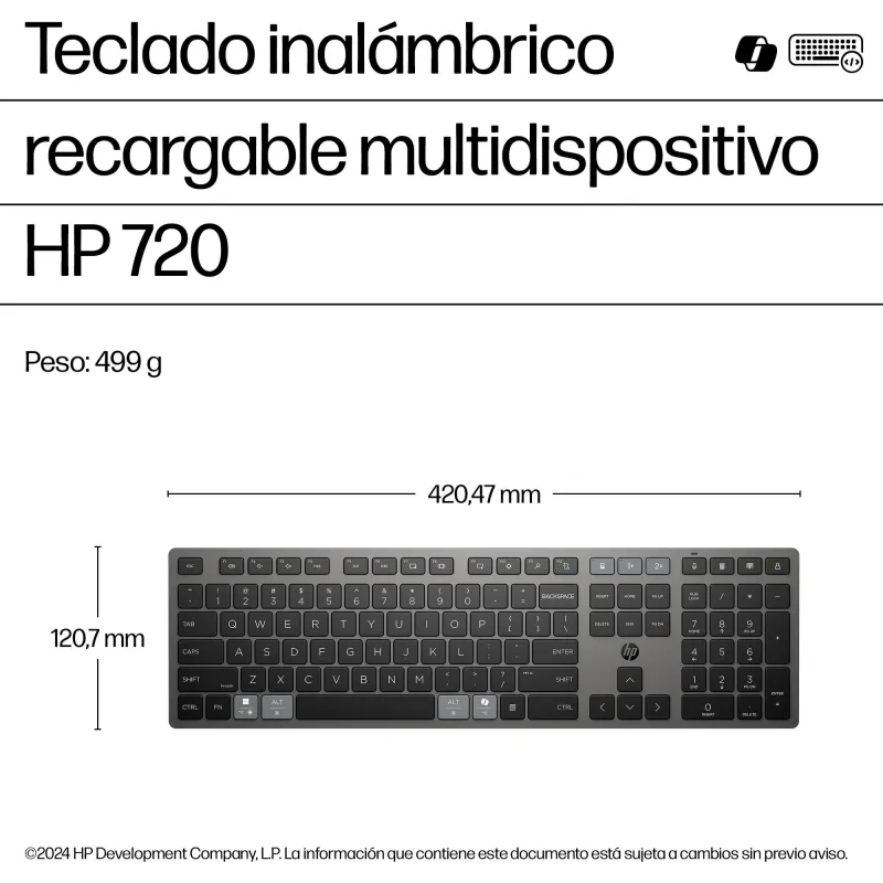 Teclado inalámbrico HP 720 con interfaz USB y Bluetooth, teclado numérico completo y compatibilidad multidispositivo, en color gris.