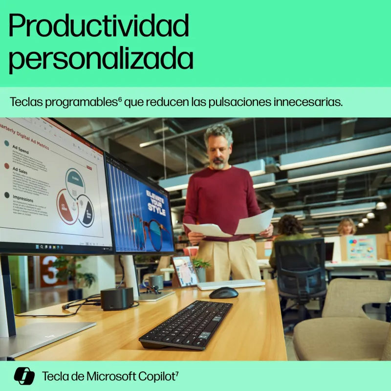El Teclado inalámbrico HP 720 ha sido diseñado pensando en la funcionalidad y la comodidad. Su estructura completa incluye un teclado numérico completo que mejora la eficiencia en tareas cotidianas. Gracias a su interfaz USB y Bluetooth, se puede conectar simultáneamente a varios dispositivos, alternando entre ellos con facilidad. Las teclas rápidas programables y la tecla Copilot optimizan el acceso a funciones específicas, mejorando la productividad. Además, su certificación FSC y otros sellos internacionales garantizan un compromiso con la sostenibilidad. Con una vida útil de 10 millones de pulsaciones por tecla, este teclado está preparado para un uso intensivo, tanto en casa como en la oficina.