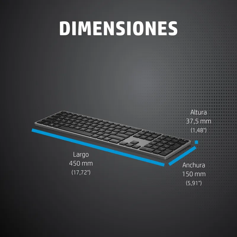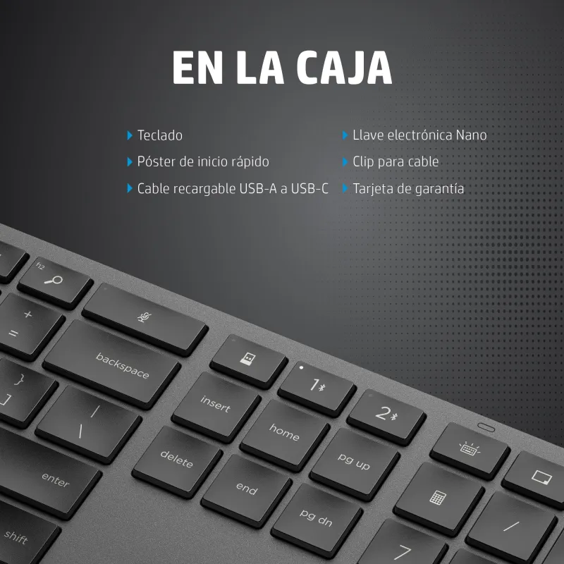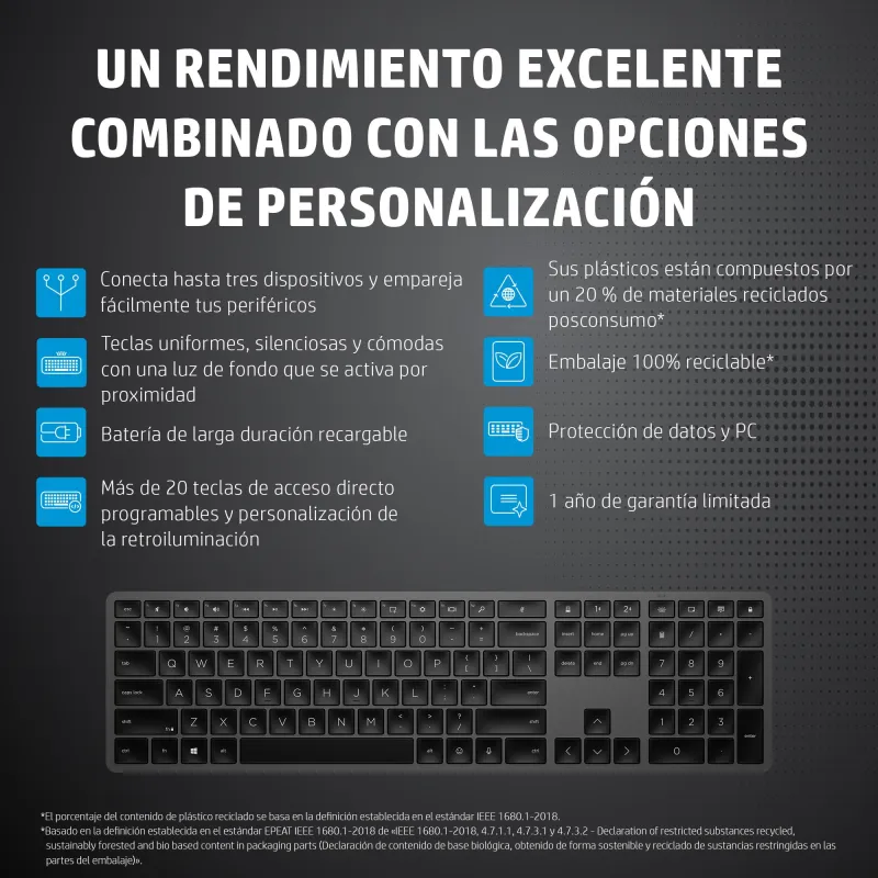 Teclado HP 975 Negro con conectividad RF Wireless y Bluetooth, teclado retroiluminado recargable por USB Tipo C. Teclado retroiluminado.